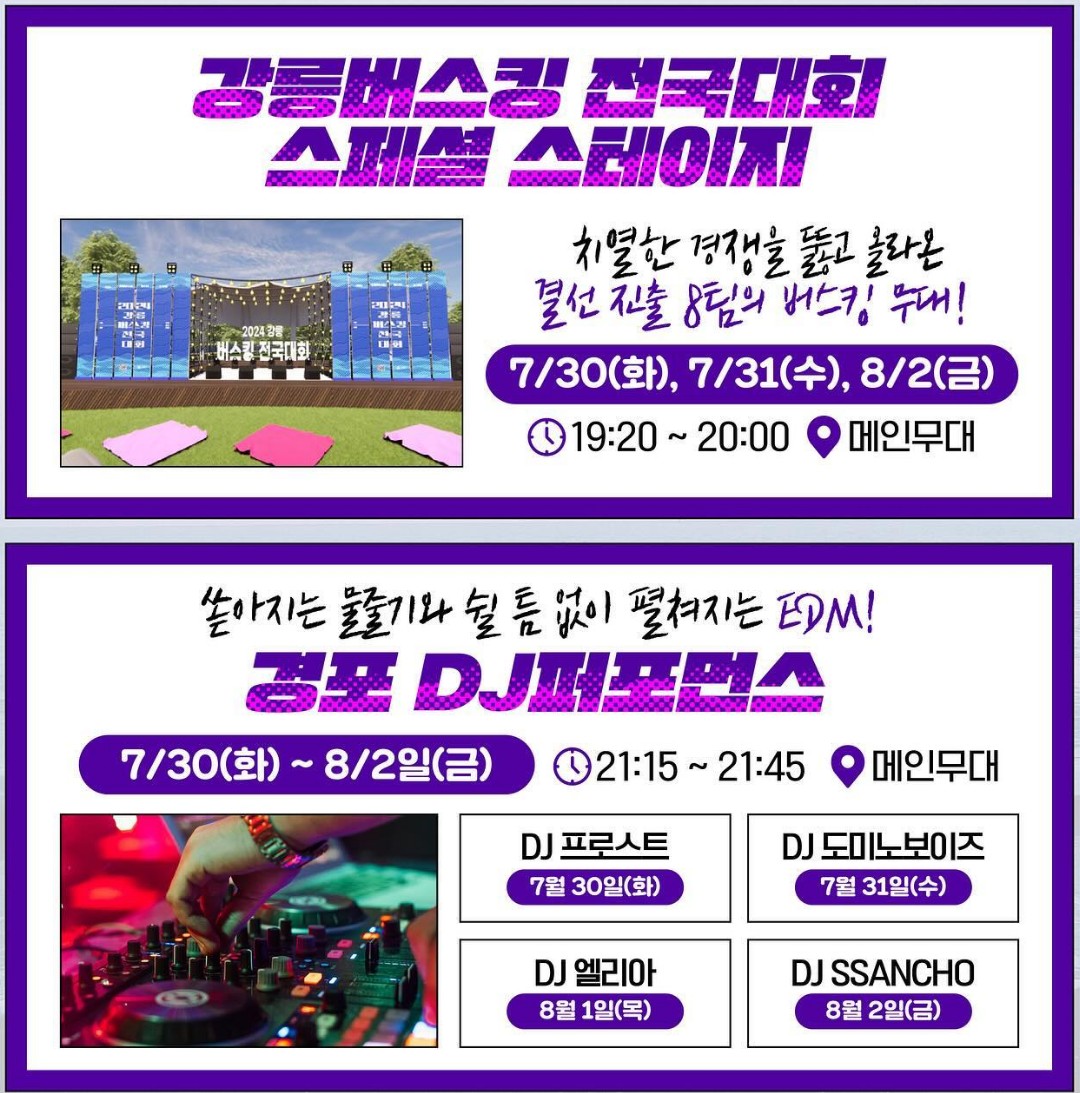 이번 축제는 7월 30일부터 8월 5일까지 여름휴가철에 맞춰 진행되며 강릉의 대표적인 관광지인 경포해수욕장에서 펼쳐집니다. 매일 신나는 축하공연과 관람객들이 참여할 수 있는 프로그램이 열립니다.