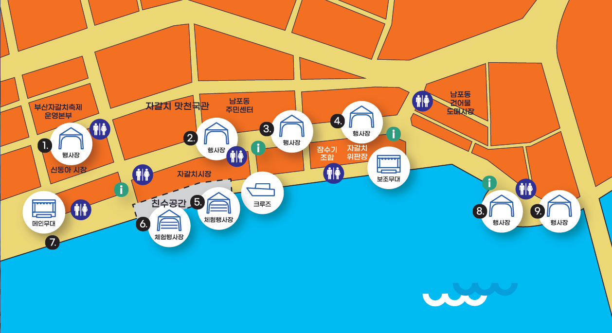 - 장소 : 자갈치 현대화건물 정중앙 앞 출입문 주변 및 신동아 인도 동편 끝 주변