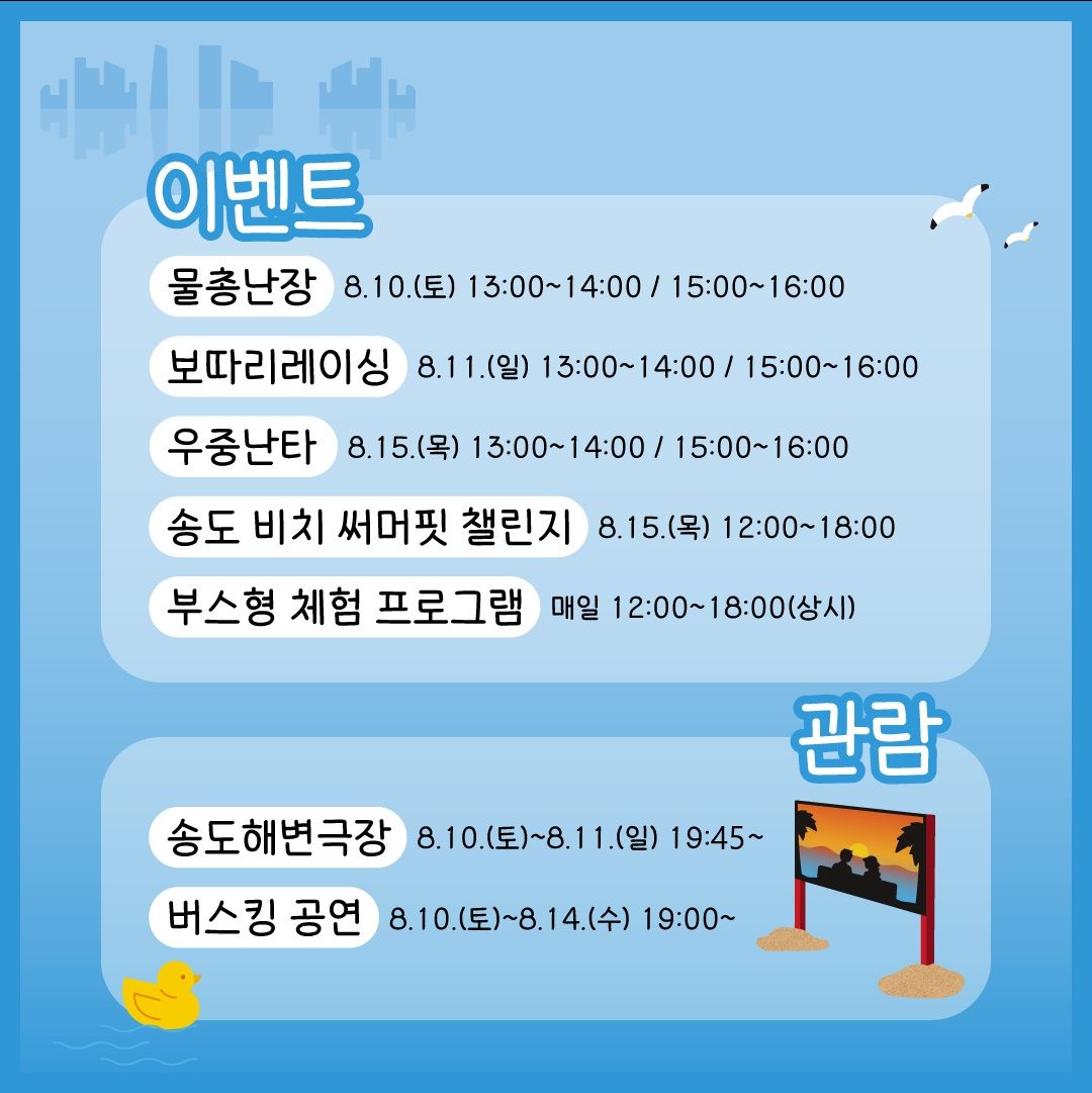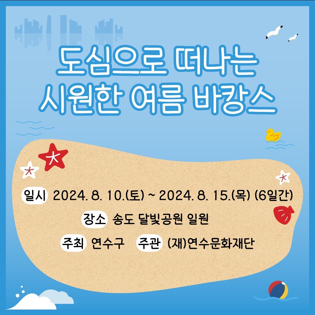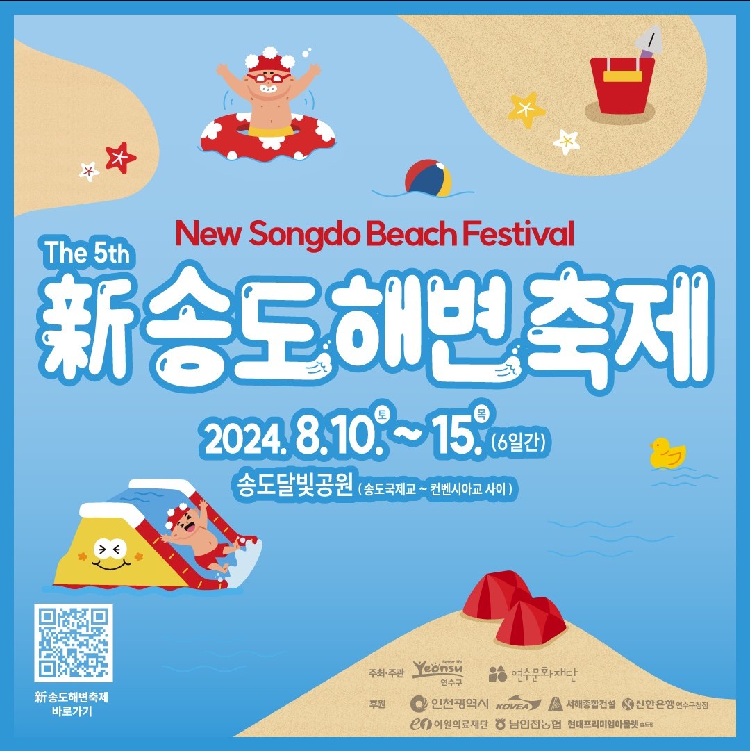제5회 2024 신송도해변축제가 8월 10일부터 8월 15일까지 송도달빛공원 일원에서 진행됩니다. 물놀이장과 인공백사장, 캠프닉존 등 온 가족이 함께 놀고 쉴 수 있는 행사가 될 것입니다. 공연과 함께 체험프로그램이 준비되었으니 일정을 확인하고 참여해 보시기 바랍니다.
