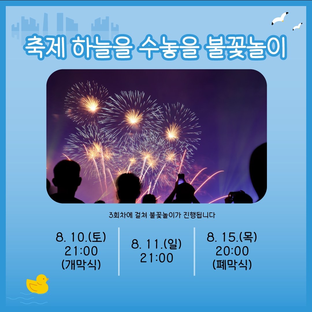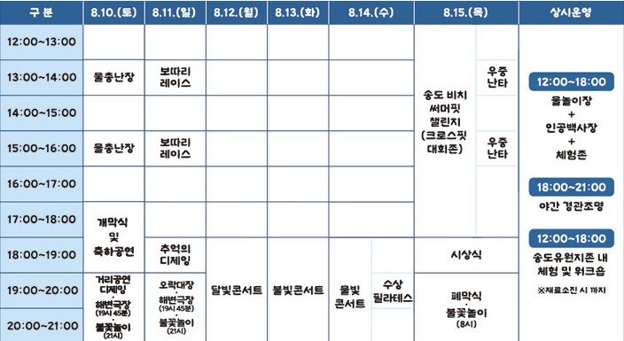 | 폐막식 | 8월 15일 18시 불꽃놀이 |