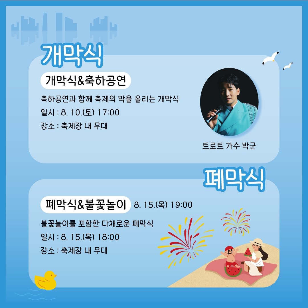 | 개막식 | 8월 10일 17시 가수 박군 |