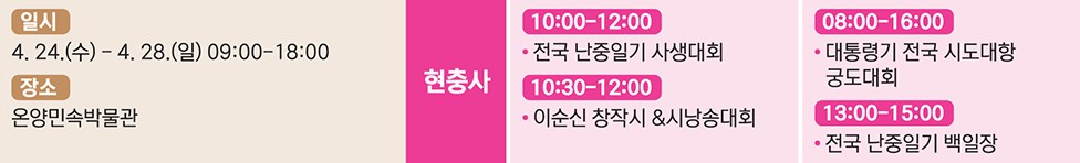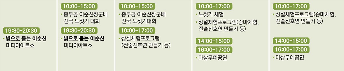 2024 제63회 이순신 축제 행사가 4월 24일(수요일)부터 4월 28일(일요일)까지 5일간 진행됩니다. 군악의장 페스티벌, 문화예술공연, 걷기 대회, 마라톤, 노젓기대회 등 다채로운 프로그램이 준비되었습니다. 일정을 확인하시고 참여해 보시기 바랍니다.