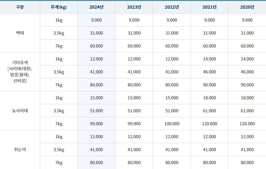 | 구분 | 무게(kg) | 2024년 가격 |
