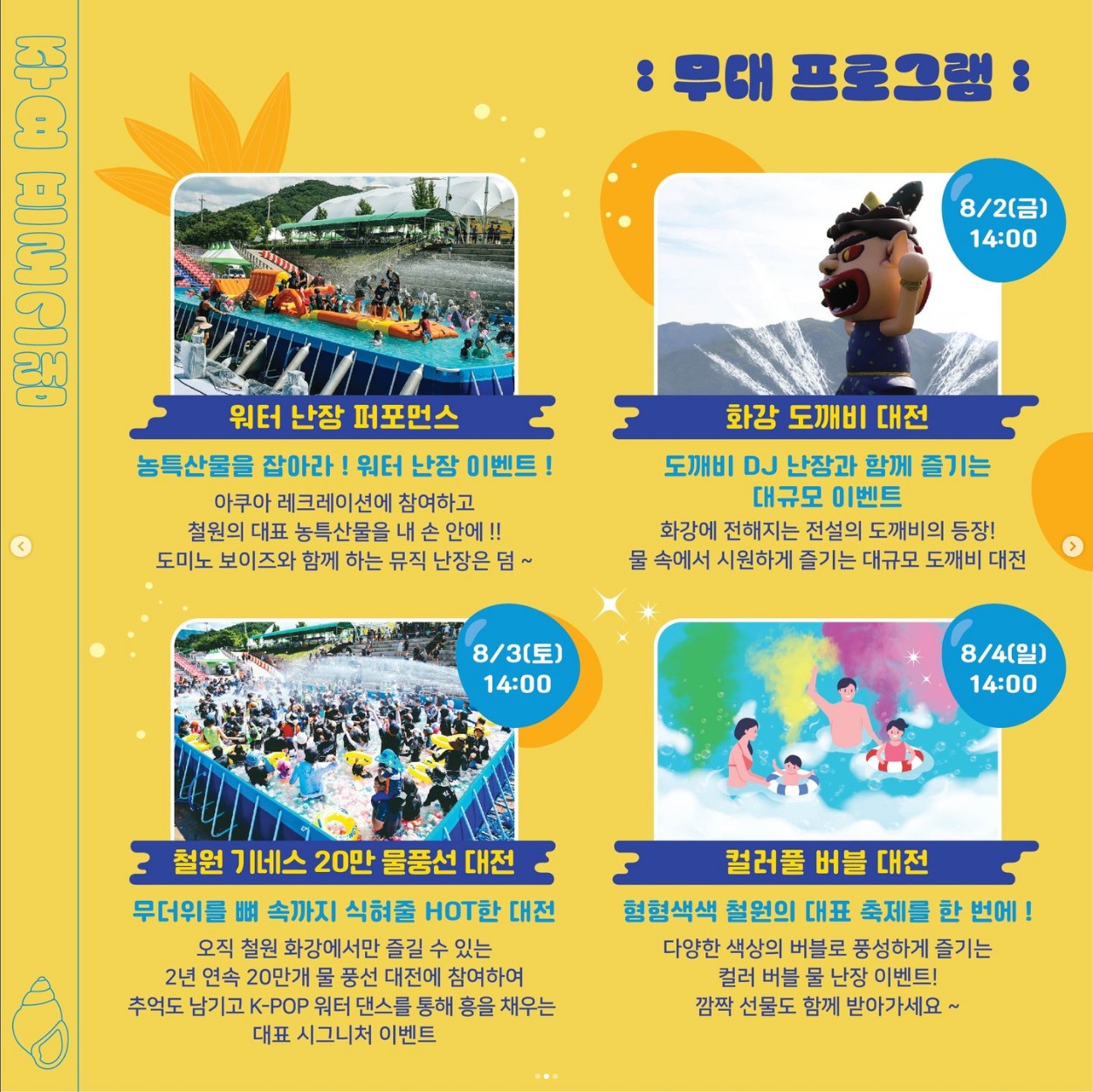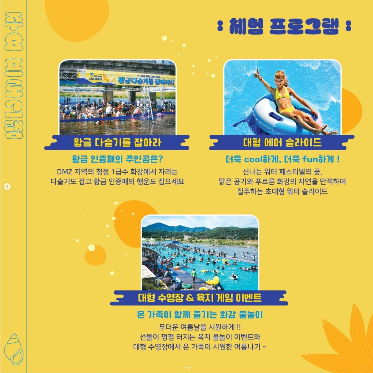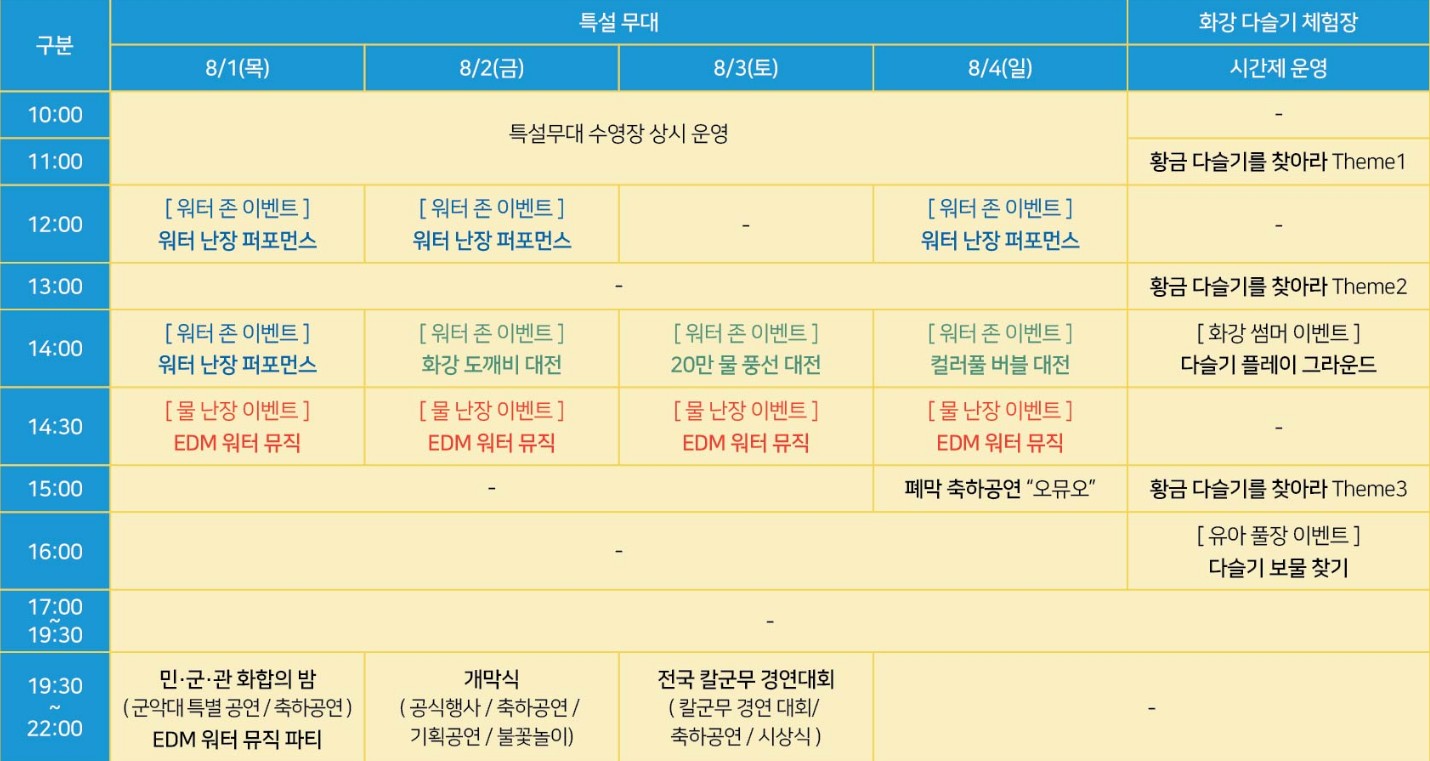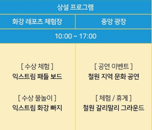 1 급수인 화강 일대에서 다슬기와 물을 테마로 진행되며 가족이 함께 즐길 수 있는 다슬기 잡기, 물놀이, 군장비 체험 등의 체험 프로그램이 준비되었습니다.