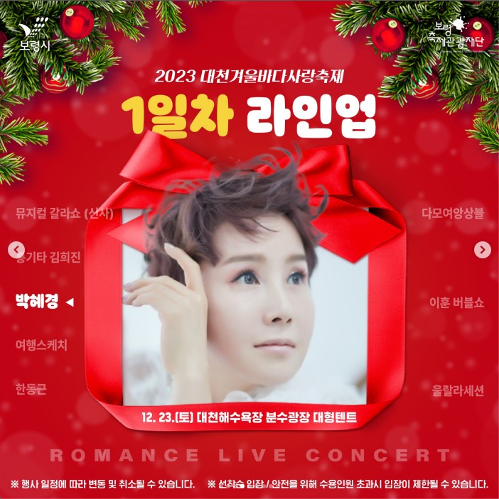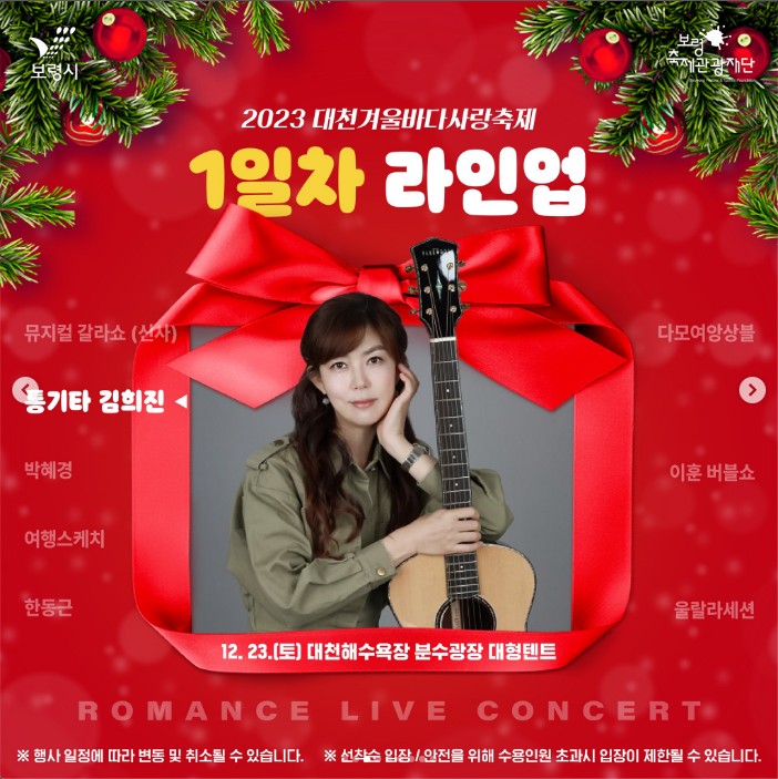 2023 대천겨울바다사랑축제 행사가 2023년 12월 23일(토)부터 12월 25일(월)까지 진행됩니다. 가수들의 공연과 불꽃쇼, 예쁜 사진을 찍을 수 있는 경관을 마련하였고 가족이나 친구와 함께 즐길 수 있는 체험 프로그램들이 준비되어 있습니다.