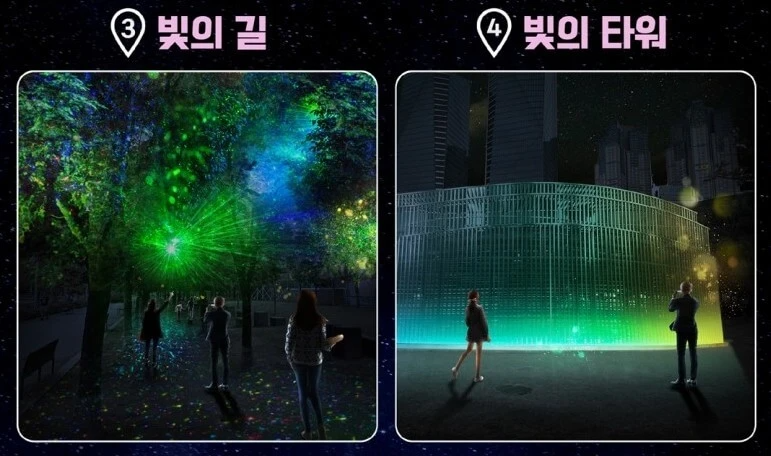 3. 레이저와 라이팅 조명으로 화려한 빛을 내는 빛이 숲길을 걸어보세요