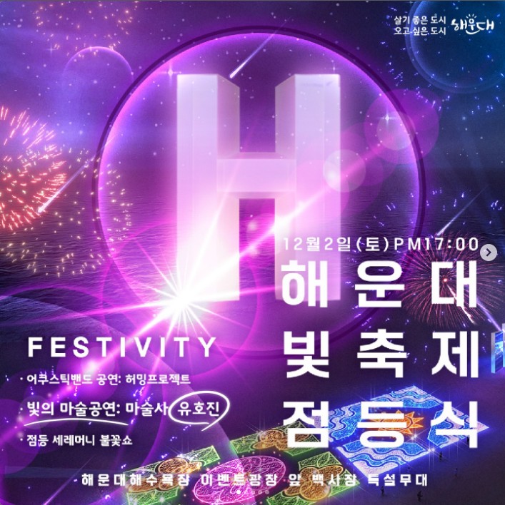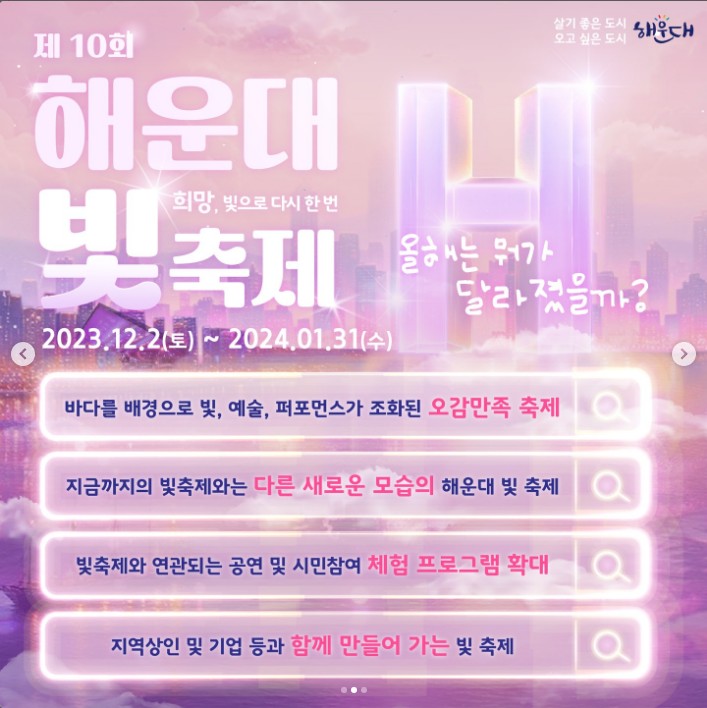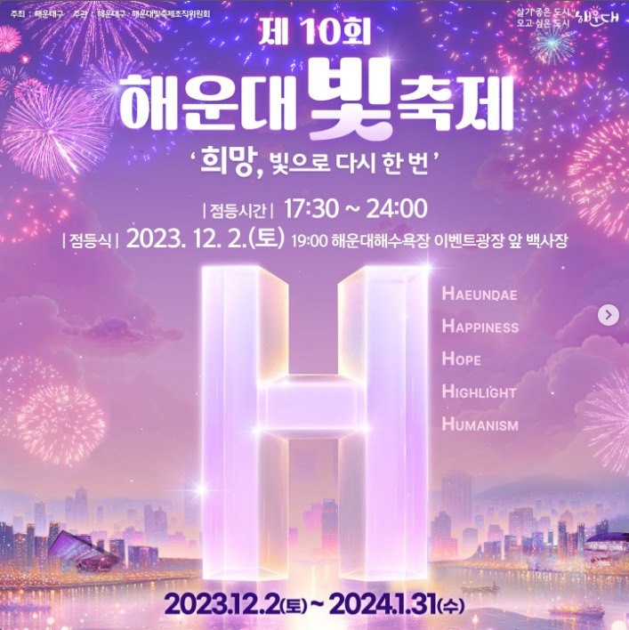 2023 제10회 해운대 빛축제가 2023년 12월 2일(토) 개최됩니다. 19:00에 진행되는 개막점등식을 시작으로 2024년 1월까지 진행되며 LED 빛 조형물 전시와 체험 프로그램, 버스킹, 콘서트 등 다양한 볼거리를 준비하였습니다. 더욱 새로워진 해운대 빛축제에 대해서 알아보겠습니다