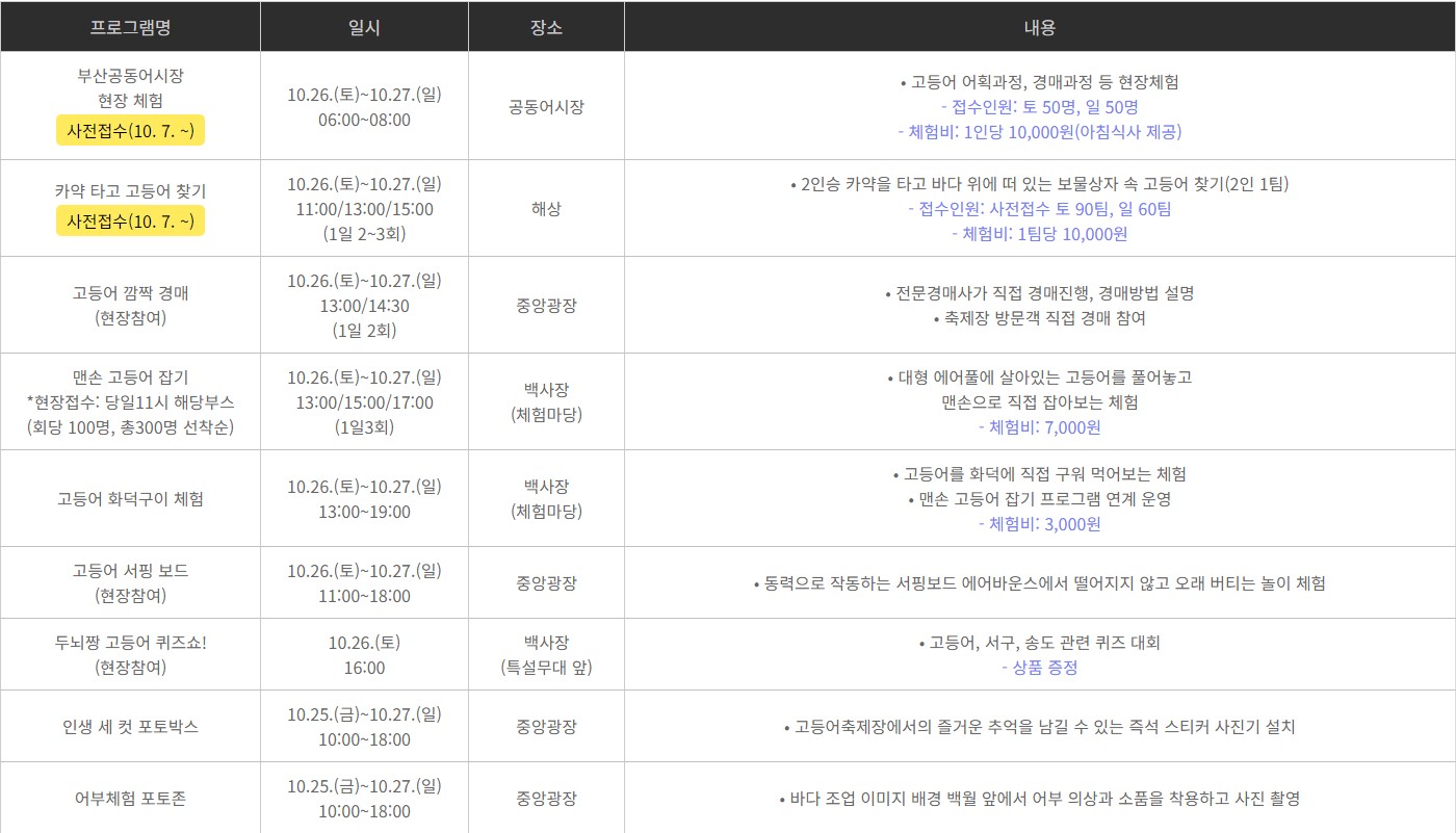 2023 제14회 부산 고등어축제 행사가 2023년 10월 27일(금요일)부터 10월 29일(일요일)까지 3일간 송도해수욕장에서 개최됩니다 부산공동어시장 현장체험, 고등어 경매, 고등어 잡기, 요리하기 등 고