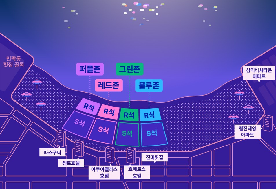 축제가 열리는 중심지로 불꽃을 가장 가까이에서 즐길 수 있는 장소입니다.