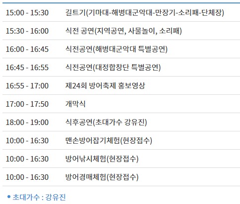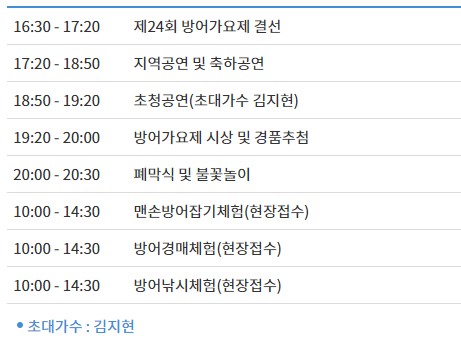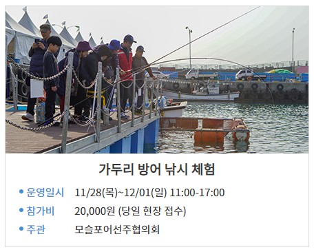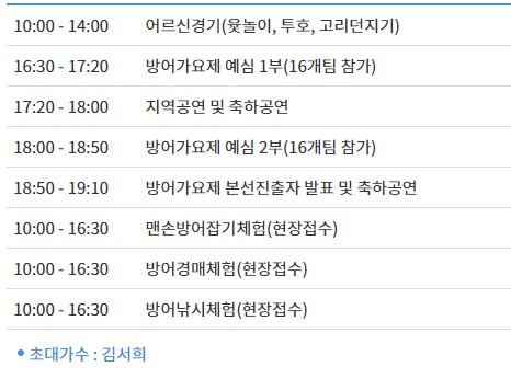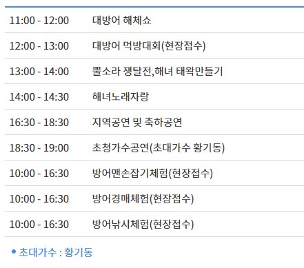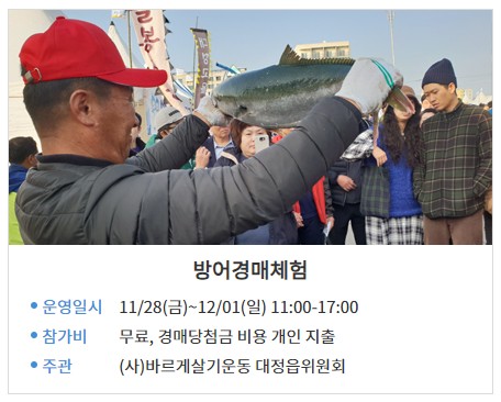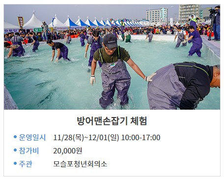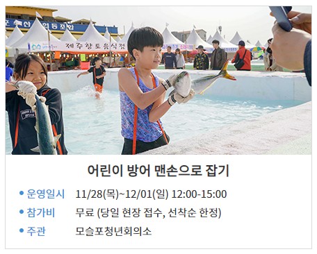 제주도에서 열리는 2024 최남단 방어축제가 11월 28일(목요일)부터 12월 1일(일요일)까지 4일간 진행됩니다. 방어 잡기, 무료 시식 등 참여할 수 있는 프로그램과 축하 공연이 준비되어 있으니 일정을 확인하시고 참여해 보시기 바랍니다.